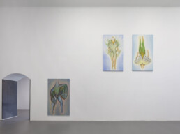 In the series of paintings titled Blind Swim, forms flow between the plant, human, and animal. They are hybrid and in motion with others; their head characteristics dissipate, their identity is diffused among various organisms, so they sprout and become leafy stalks; they grow feathers, butterfly or moth wings. All seem to be interdependent and interconnected, challenging any kind of life hierarchy. Rosier pictures them in a moment of joy, of serenity without stillness. Movement is integral to the construction of this political imaginary, a movement of tenderness and care, a dance across surfaces, escaping narrow demarcations.